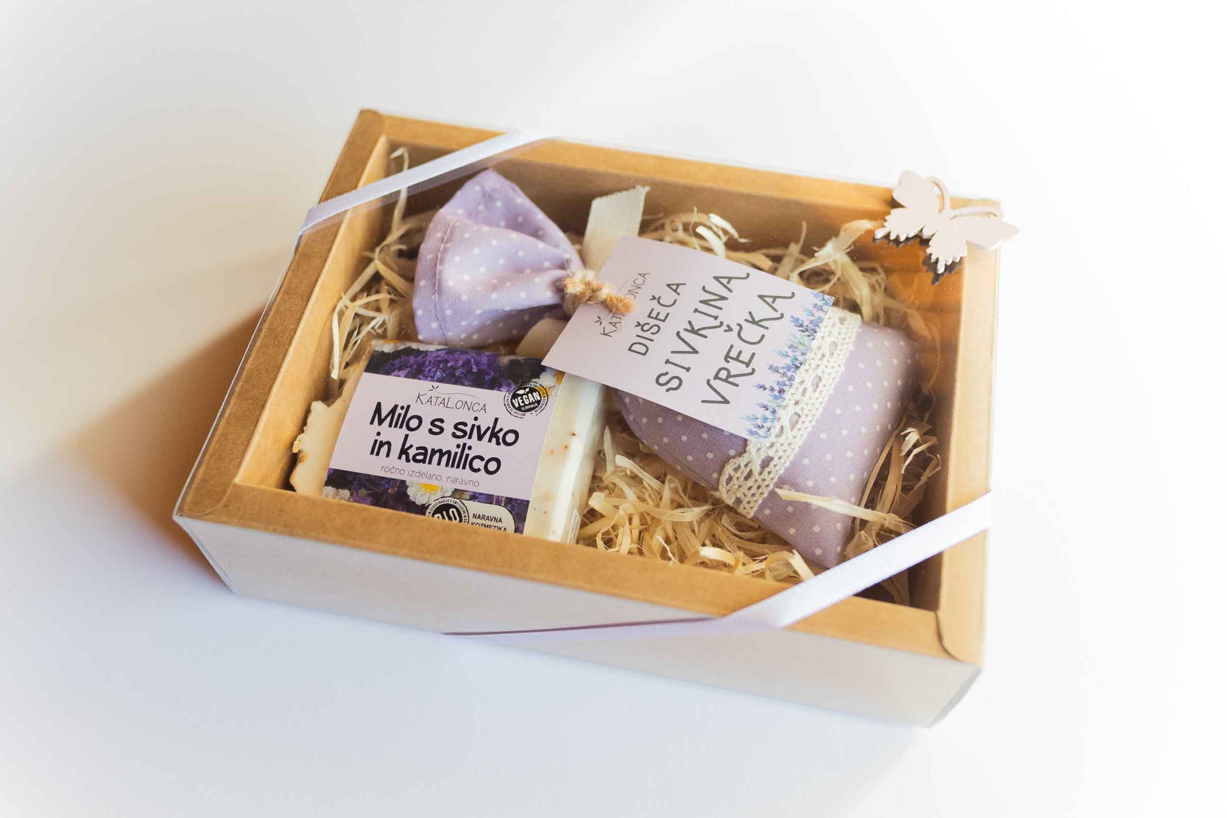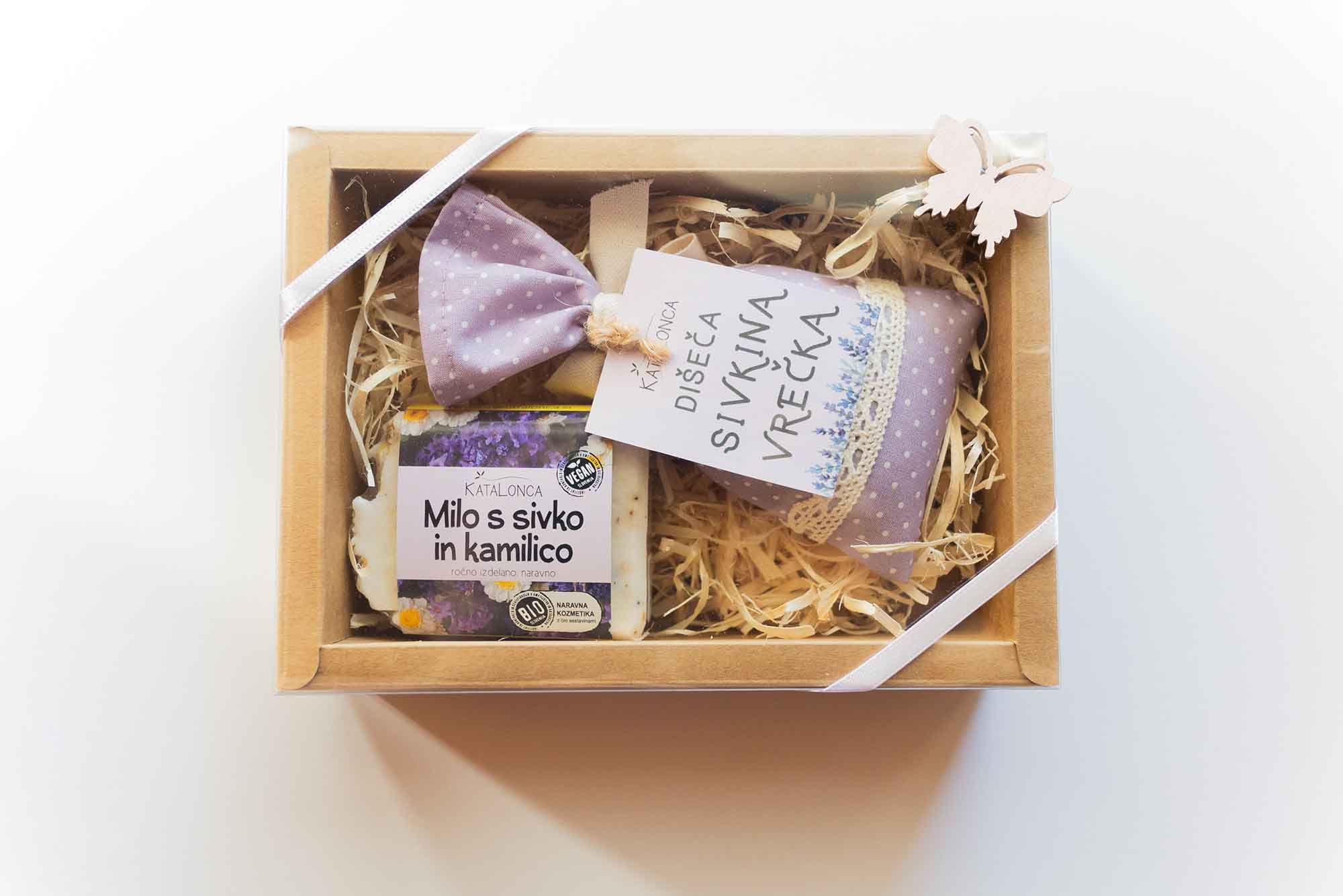 Darlini paketek vsebuje: – 1x Dišeča sivkina vrečka – 1x Naravno milo (po izbiri)